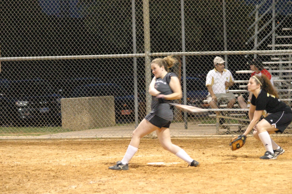 Kelly B looks to the heavens before she bats in the top of the 5th inning (most likely watching a foul ball she hit being thrown back onto the field). |
